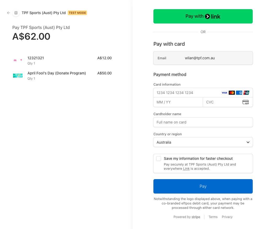 - Processed via the configured payment gateway