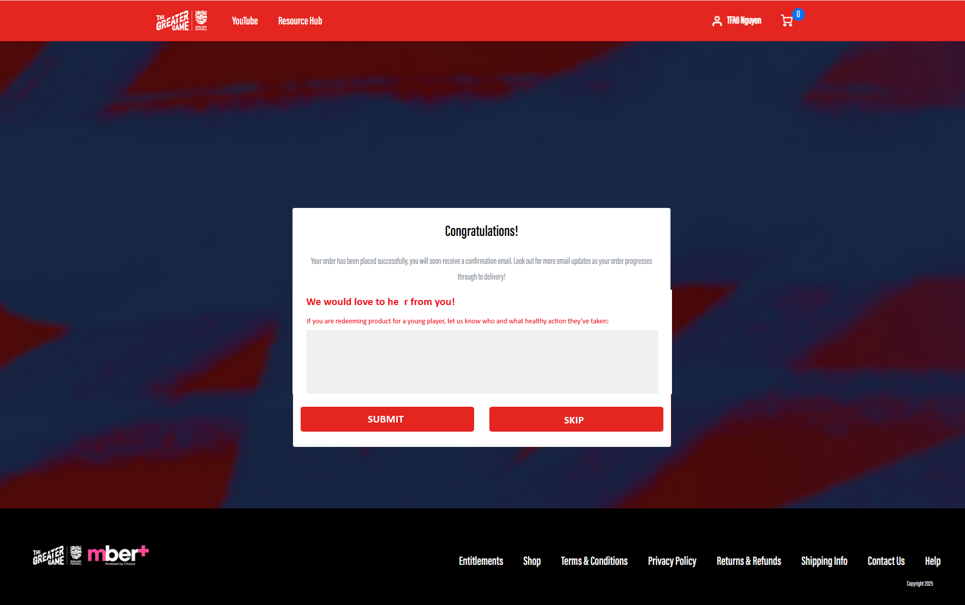 - Skipping allows customer to continue without submitting and redirected to home page